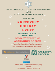 DC Recovery, Community Bridges, Inc., and Volunteers of America presents A Recovery Holiday Event. This event will include: Food, Raffles, Live Performances, Photo Booth, Speakers, Vendors